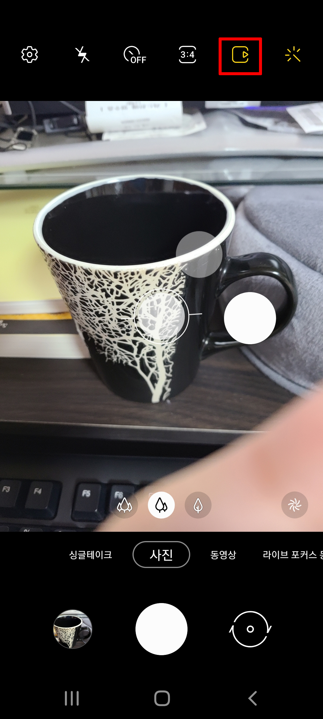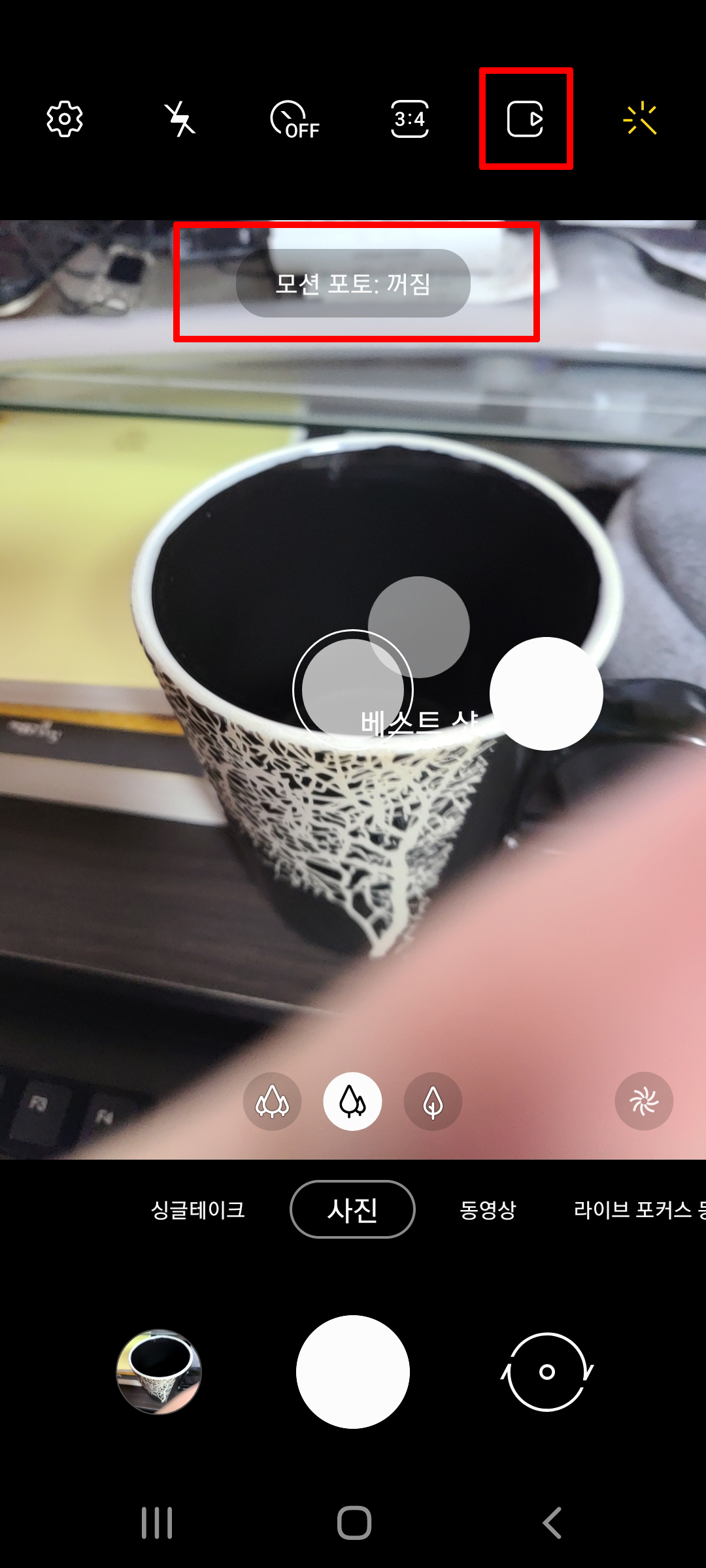 똑같이 갤럭시 카메라를 실행합니다. 오른쪽 위에 있는 비디오 재생 아이콘 같이 생긴 걸 클릭합니다. 그러면 테두리가 노란색이었던 부분이 하얀색으로 변하고 모션 포토 꺼짐이라는 안내 문구가 잠시 나왔다 사라집니다
