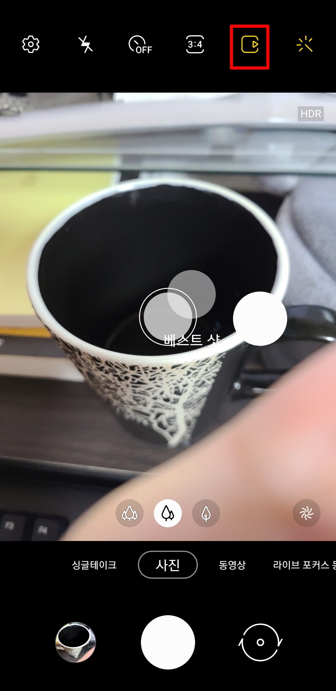 모션 포토 기능은 처음에 설정되어 있을텐데요. 설정이 되어 있다면 갤럭시 카메라를 실행시 맨 위에 오른쪽에 비디오 재생 아이콘 비슷한게 노란색으로 되어 있으면 모션 포토 기능이 활성화 되어 있는 겁니다