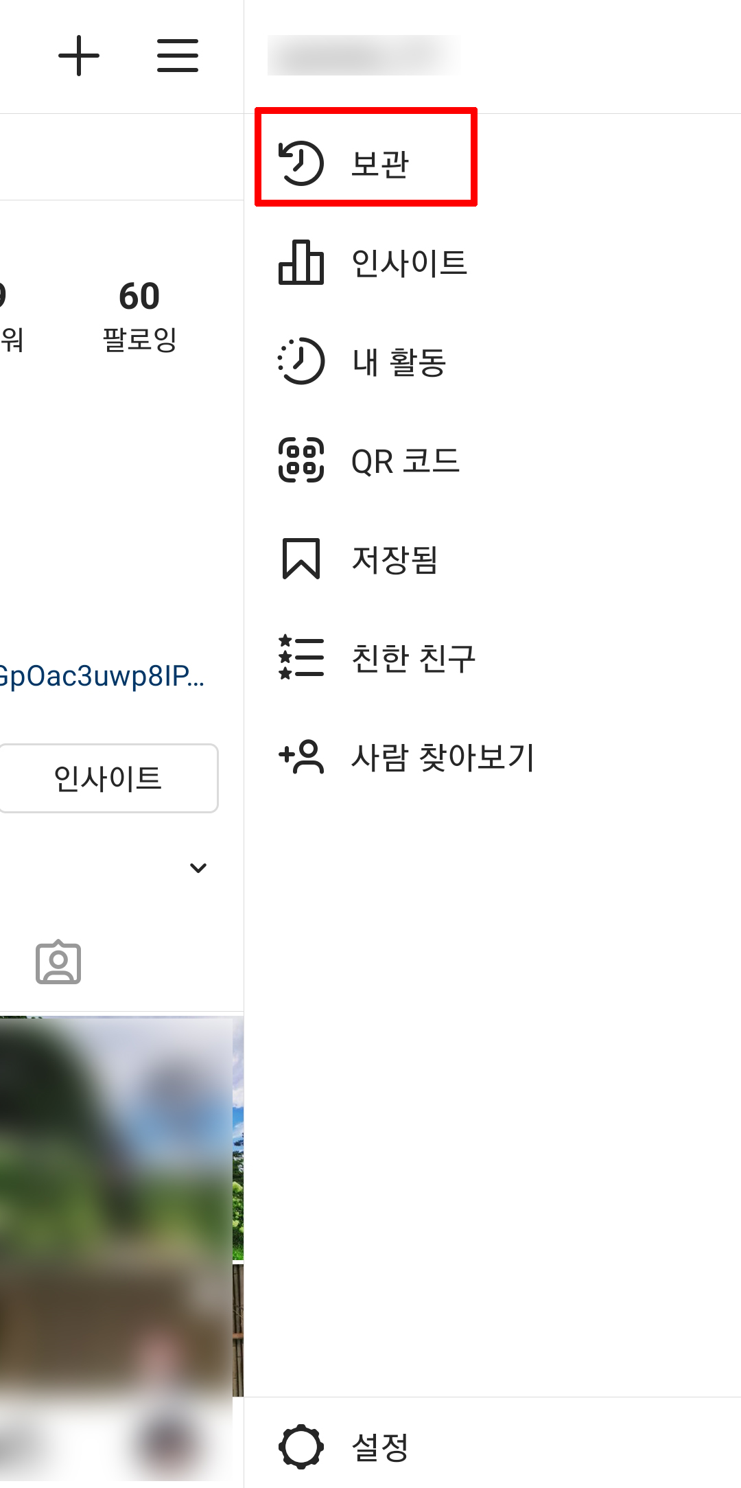 오른쪽에 여러 메뉴 항목들이 나오고 맨위에 있는 보관을 클릭합니다