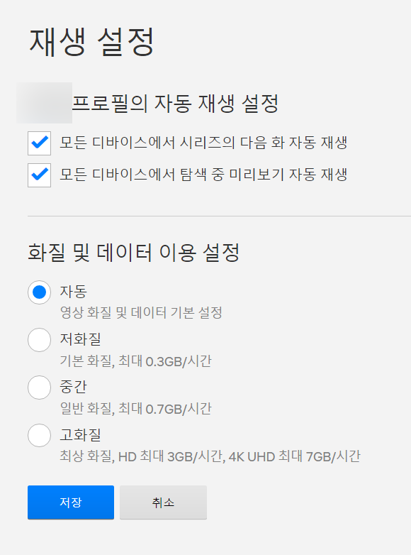 재생 설정에서 본인이 원하는 화질을 선택하고 저장을 클릭합니다