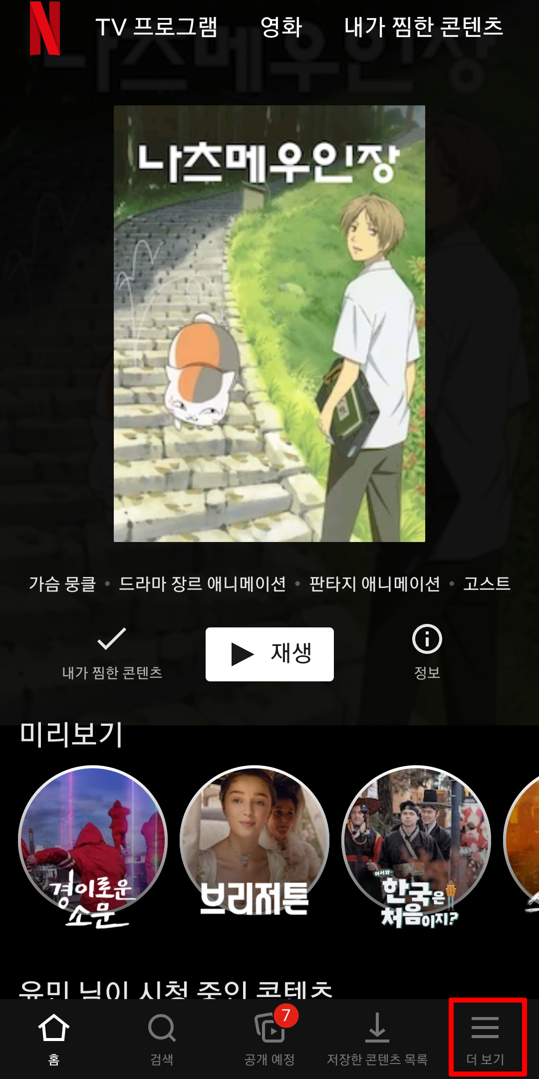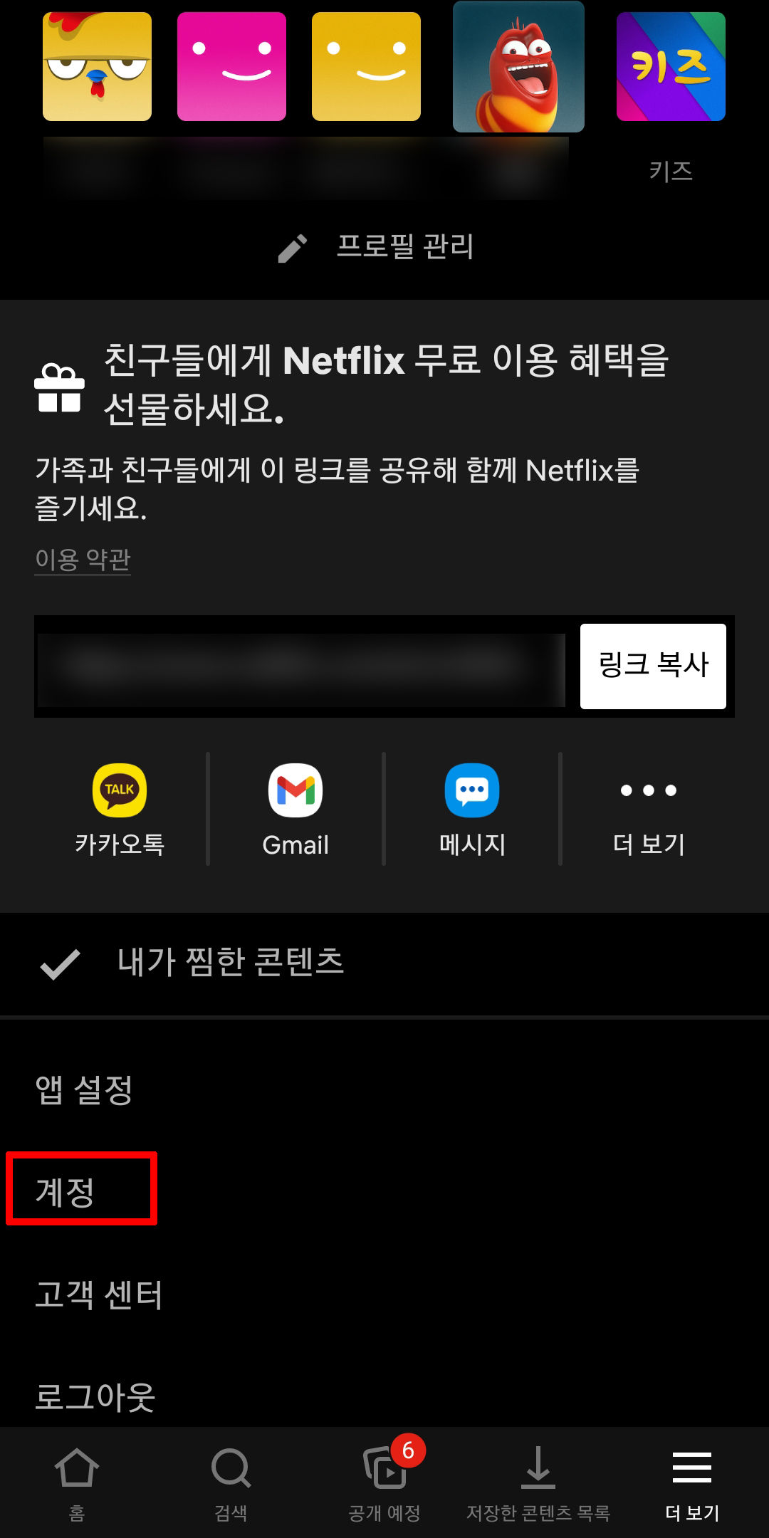 모바일에서 넷플릭스를 실행합니다. 계정으로 접속하고 맨 오른쪽 아래에 있는 더보기 아이콘을 클릭합니다