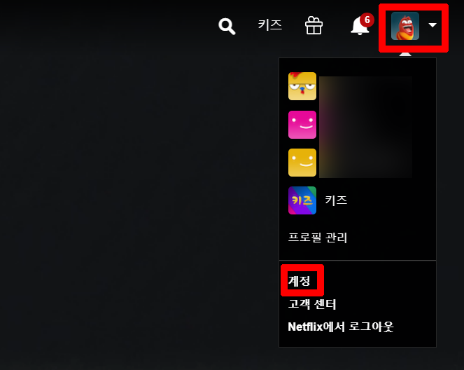 컴퓨터에서 넷플릭스로 접속합니다. 오른쪽 상단에 계정 아이콘을 선택합니다. 아래에 계정을 클릭합니다