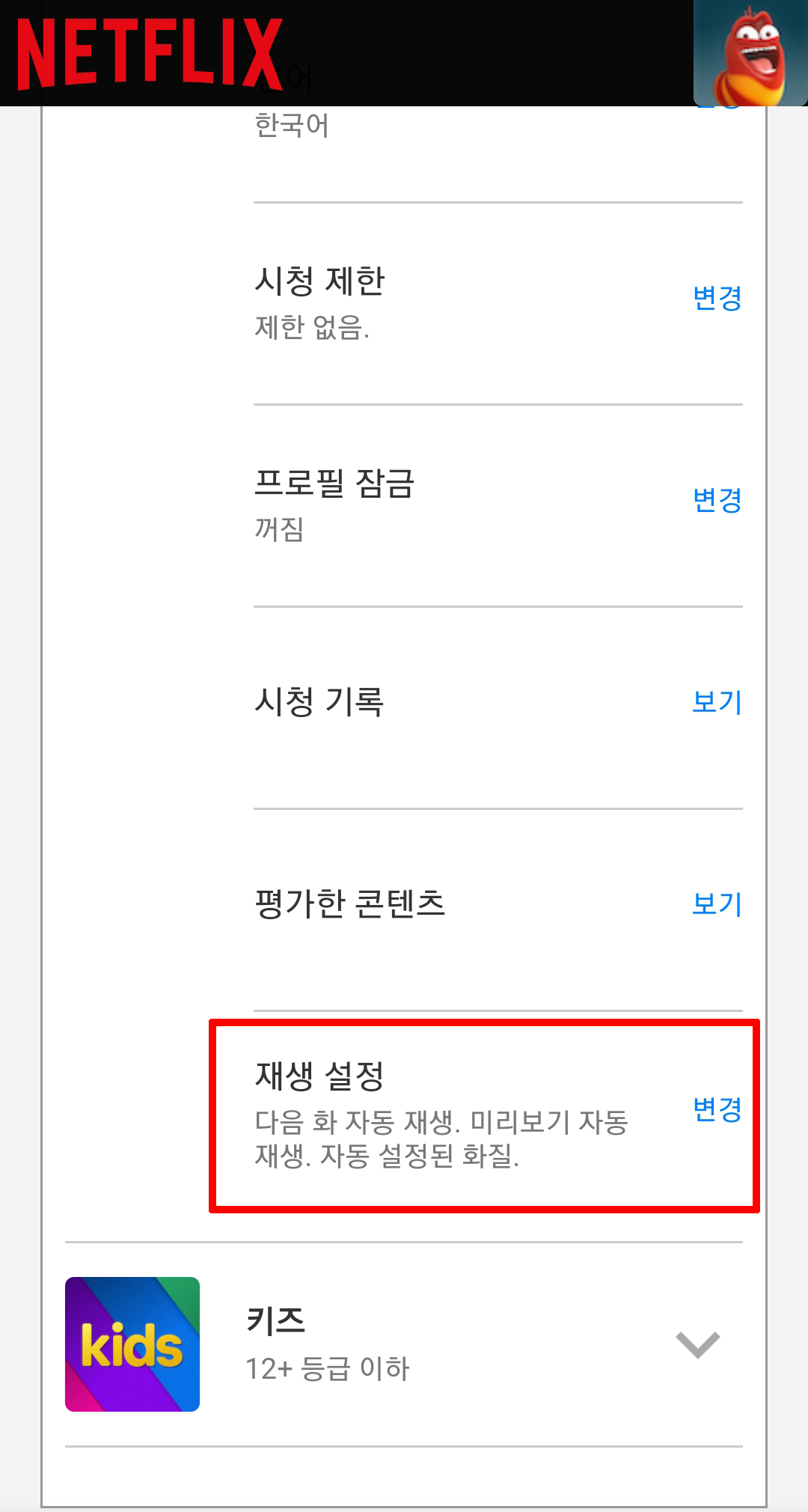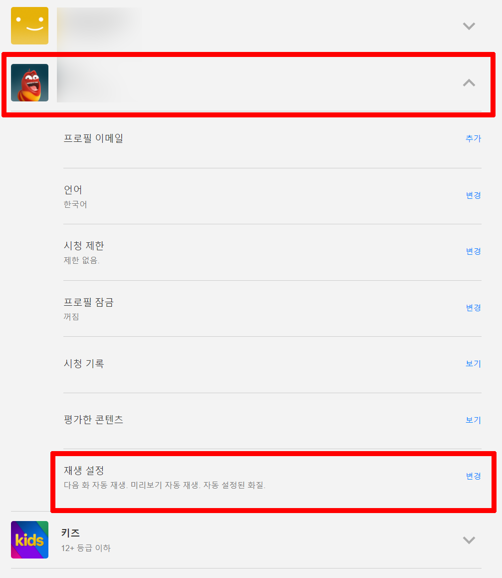 계정을 이동하고 아래로 내리면 프로필 항목이 있습니다. 만약 회선을 여러 명과 사용하고 있다면 본인 계정을 선택합니다. 그러면 여러 가지 항목 중 맨 아래에 있는 재생 설정을 클릭합니다